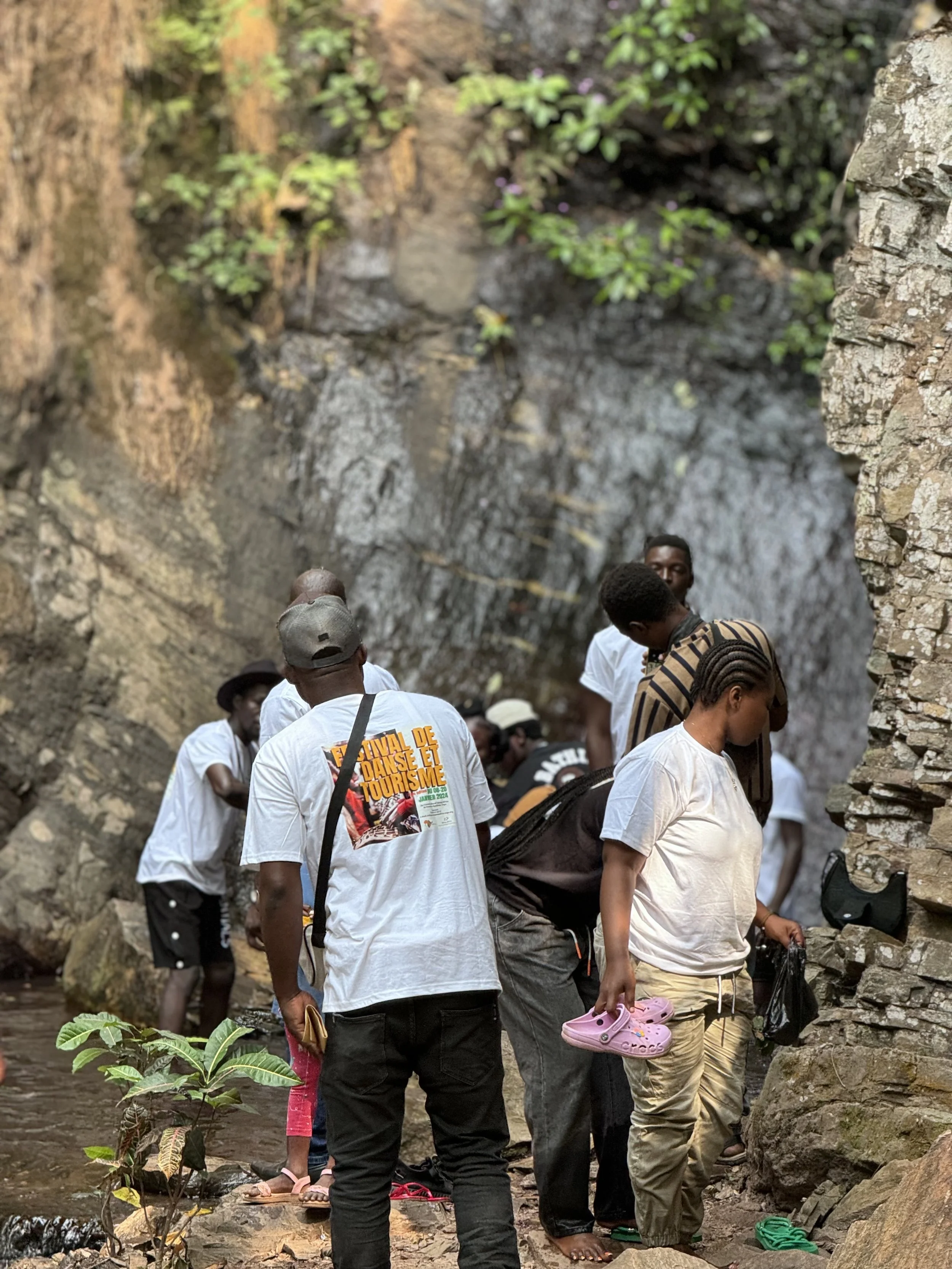 Groupe de personnes près d'une paroi rocheuse avec végétation.