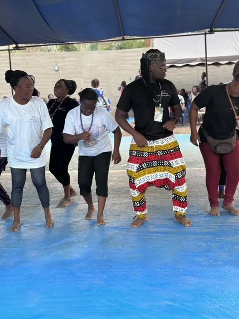 Des personnes dansent ensemble sous une tente, certaines pieds nus, sur une surface bleue. Elles portent des vêtements variés, l'une d'elles porte un pantalon coloré à motifs et une coiffe.